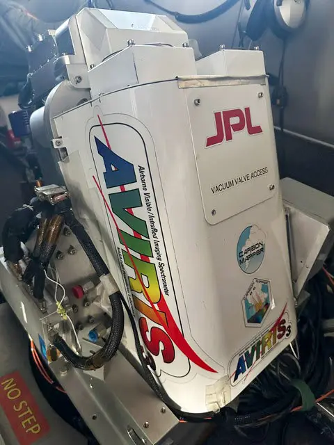 Handheld devices are used to analyze samples in the field or lab. To survey moons and planets, including Earth, NASA has developed increasingly powerful imaging spectrometers over the past 45 years. One such instrument is called AVIRIS-NG (Airborne Visible/InfraRed Imaging Spectrometer-Next Generation), shown below, which was built by JPL to fly on aircraft.
